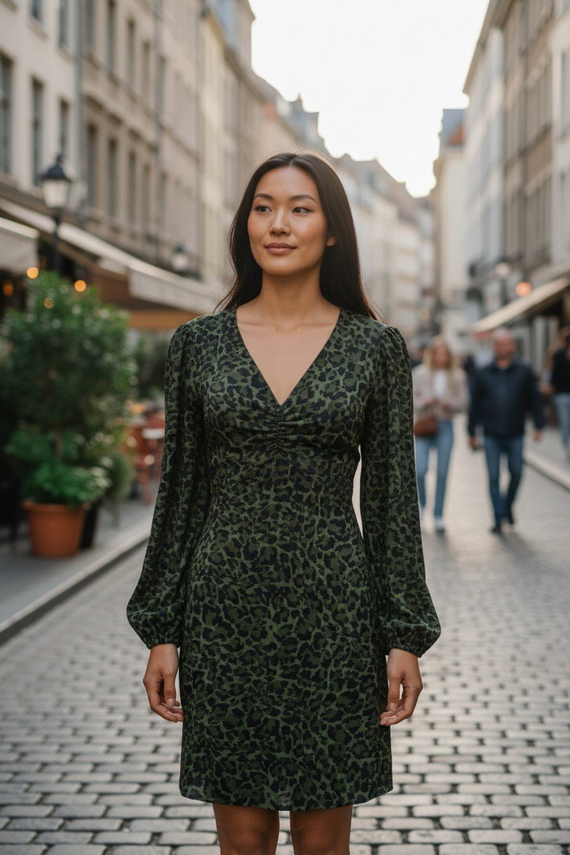 Leopard Print Midi Dress Long Sleeve with V Neck – Chic Casual Women Dress