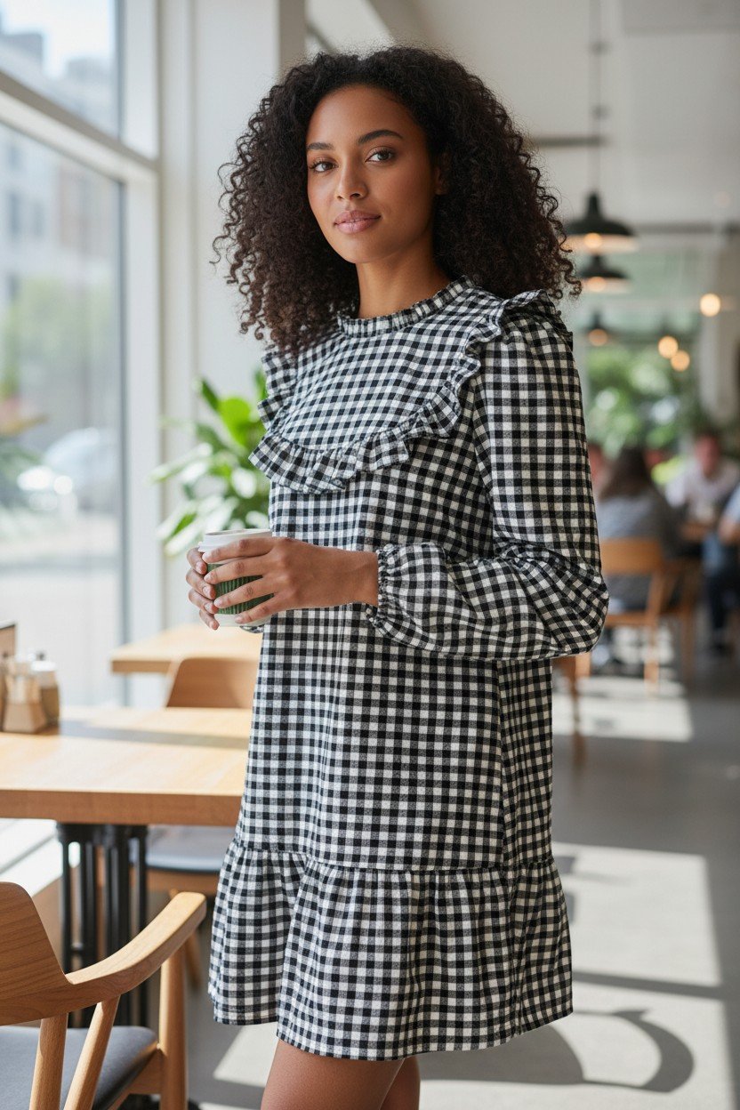 Black & White Gingham Dress with Long Sleeves and Ruffle Detail