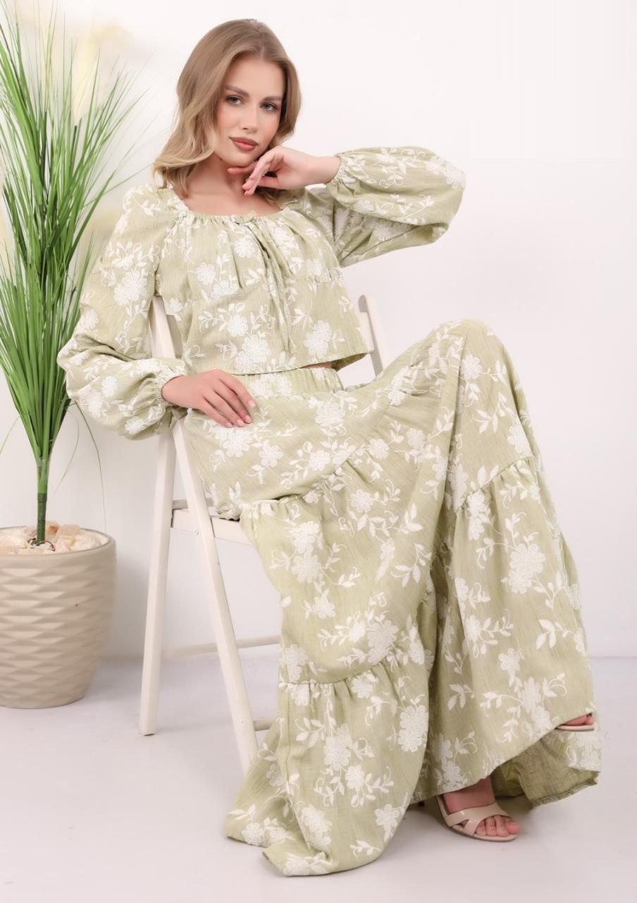 embroidered cream Set radiates a sense of pure elegance and refined taste, featuring delicate needlework that adds a layer of luxury to the soft cream fabric. This ensemble is designed for the woman who seeks a sophisticated yet comfortable outfit for high-end daytime events or special gatherings.